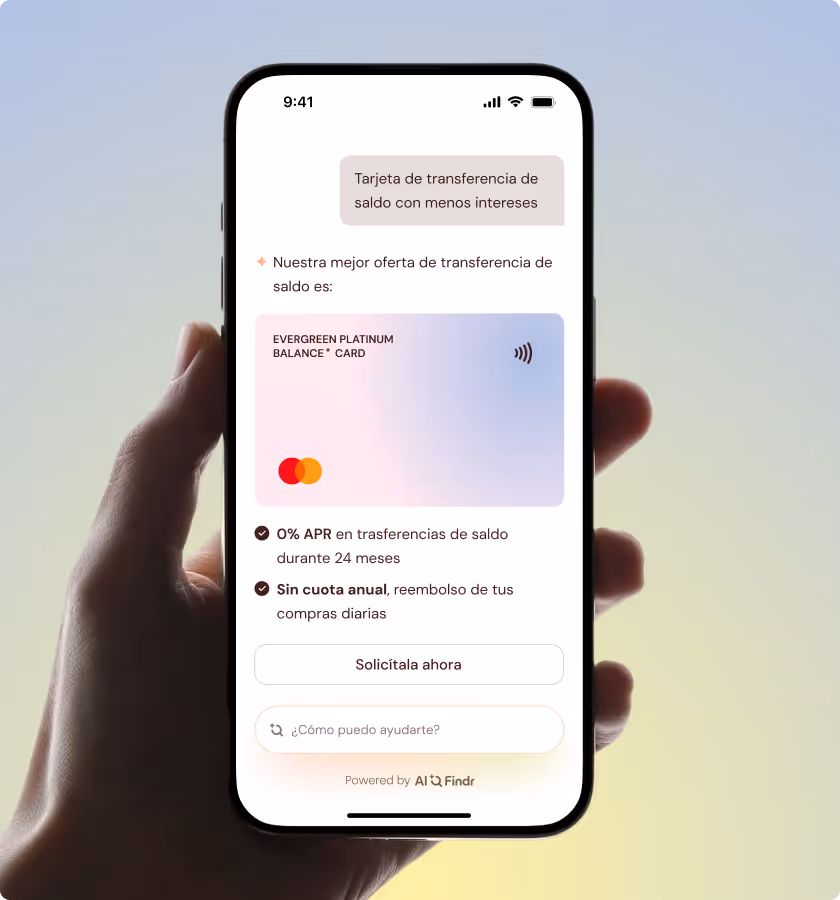 AI Findr se adapta a tus objetivos de negocio, con respuestas personalizadas y CTAs inteligentes diseñados para productos financieros y momentos clave de decisión.