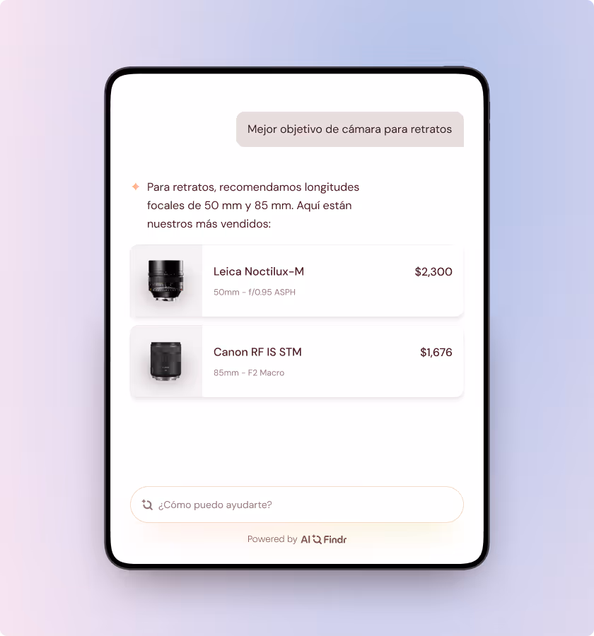 AI Findr ofrece una experiencia de compra personalizada mientras te brinda una vista en tiempo real de la intención del cliente.