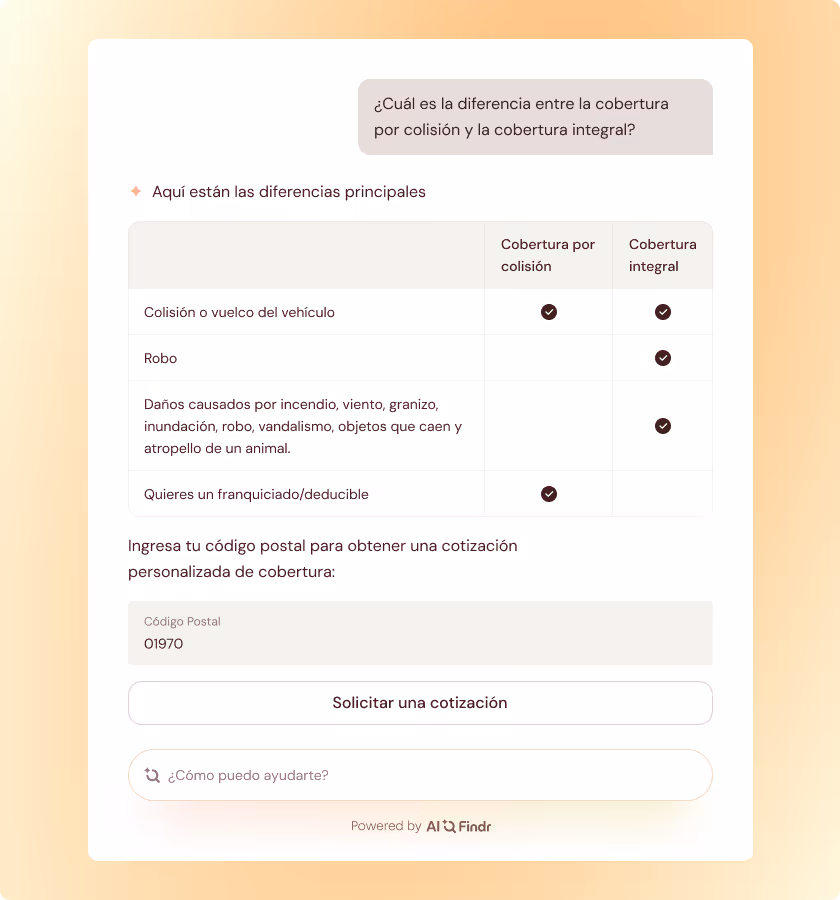 AI Findr se adapta a tus objetivos, con respuestas personalizadas y CTAs inteligentes diseñados para productos de seguros y decisiones clave de pólizas.